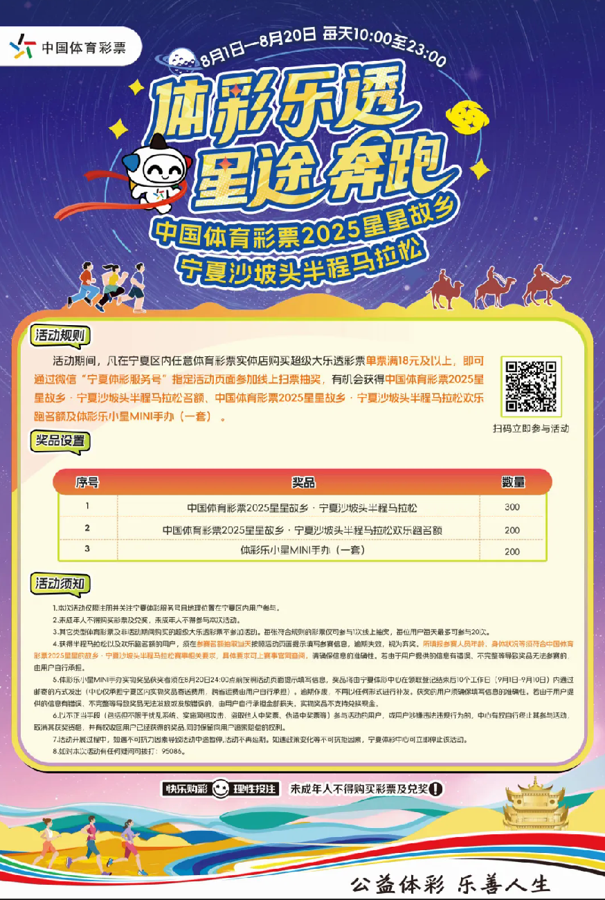 8月1日至8月20日,“體彩樂透 星途奔跑”活動強勢來襲,每天早10點到晚11點,購買超級大樂透彩票,就有機會獲得沙坡頭半程馬拉松的奔跑名額,披上星光奔向終點,為人生清單畫下另一道完美的弧線!