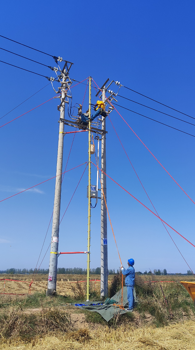 作業過程中,帶電作業班成員在農田中對“蜈蚣梯”進行定位打樁、逐節組裝并用絕緣纜風繩固定,將近12米高的“蜈蚣梯”平穩立在目標桿位附近。作業人員依托“蜈蚣梯”的穩定支撐,在高空對故障設備進行了精準、高效的帶電更換,實現了對聯絡開關的不停電檢修,保障了線路之間的正常負荷轉供能力,避免了因設備故障可能導致的用戶停電,確保了區域電網的連續穩定運行。